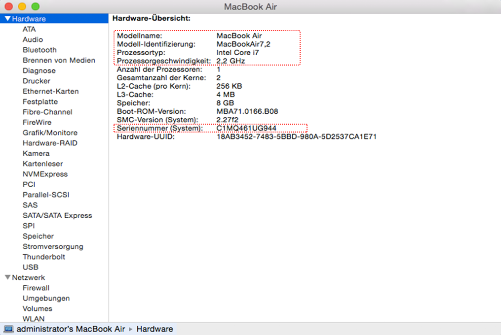 • Eine ggf. erforderliche Modell-Identifizierung (z. B. MacBookAir7.2) kann dem Systembericht entnommen werden.